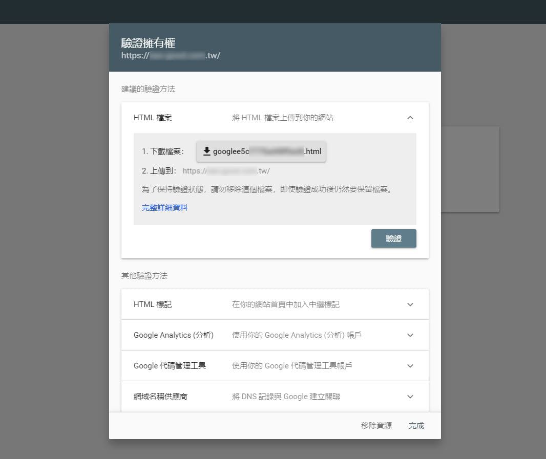 接著會出現驗證擁有權內容,而Google也貼心的支援多種方式,依照看得懂的進行就好,只是方式不一樣,結果是一樣的。如果使用Html下載檔案的方式,把下載的檔案上傳到空間,與index.html同一個目錄底下即可。